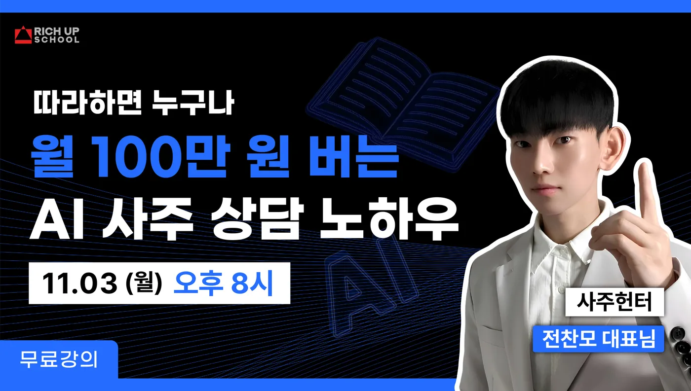 과거 사주에 대해 아무것도 모르던 시절, 한 BJ에게 사기 상담을 당하며 인생이 망가졌다는 생각에 분노와 억울함으로 잠 못 이룬 경험이 있습니다. 이를 계기로 '내가 직접 파헤쳐보자'는 결심을 하고 무속인, 스님 스승님들께 '실전 비법'을 전수받으며 미친 듯이 파고들었습니다. 그 결과, 대학생 신분으로 직장인 월급을 뛰어넘는 수익을 달성했고, 취업, 스펙 걱정 없이 경제적 자유를 얻었습니다. 이 강의는 복잡한 이론만 알려주는 강의가 아닙니다. 8년간의 실전 경험을 압축하여 카톡과 문자로, 원하는 시간과 장소에서 AI를 활용해 수익을 내는 '수익화 공식' 그 자체를 떠먹여 드립니다.
